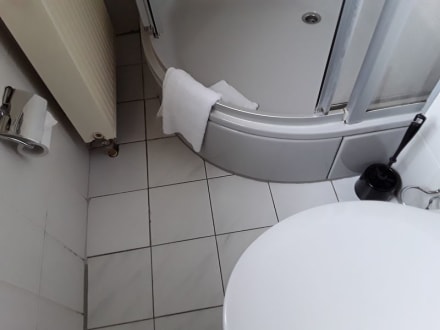 Duscheinstieg ziemlich hoch. Recht eng im Bad