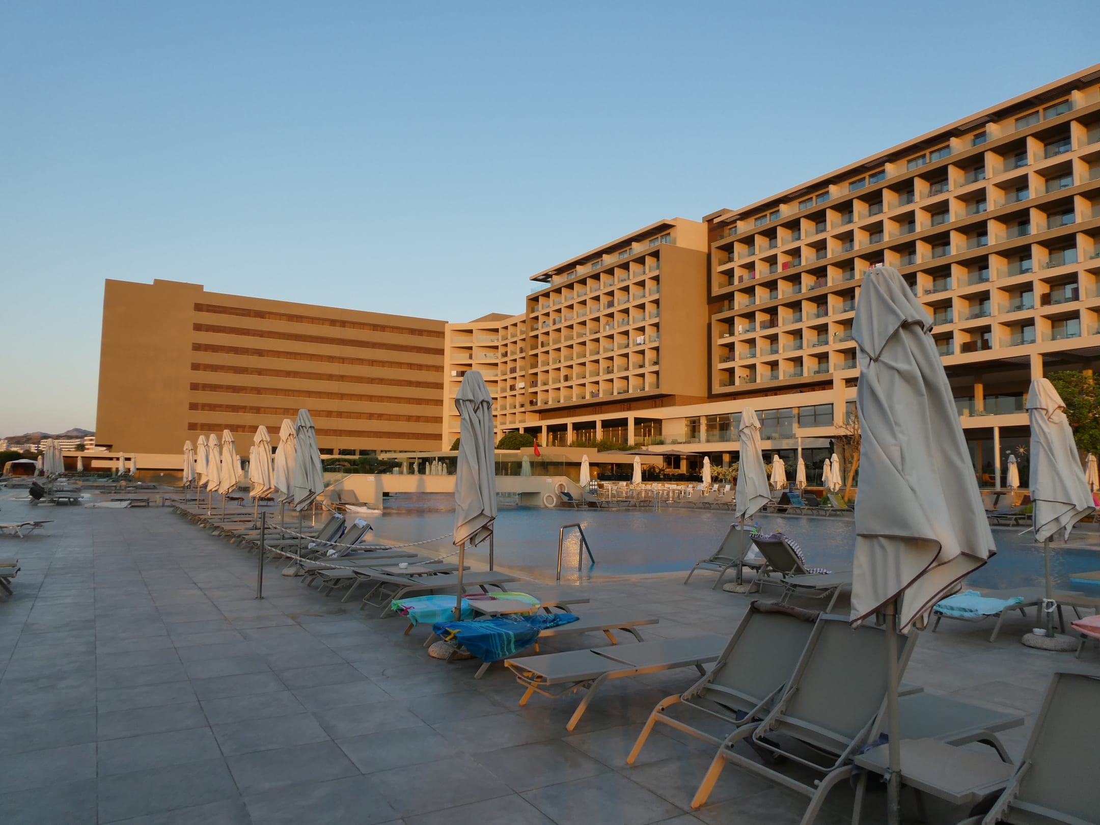 Pool am Morgen, die ersten Liegen sind schon besetzt