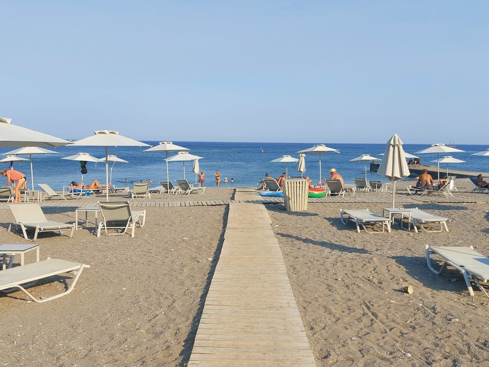 StrandStrand mit Liegen und Schirmen AI .... Kies Sand Gemisch mit Badeschuhen ins Wasser kein Problem, dafür glasklares Wasser