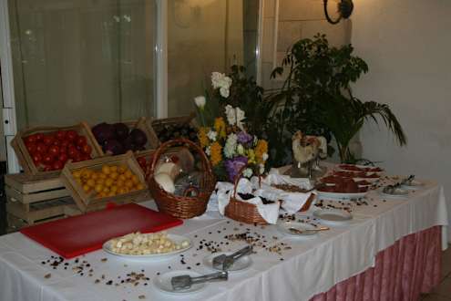 Spezialitätentisch hier beim FrühstückHartkäse, Rosinen, roher Schinken, Nüsse, Datteln o.ä.