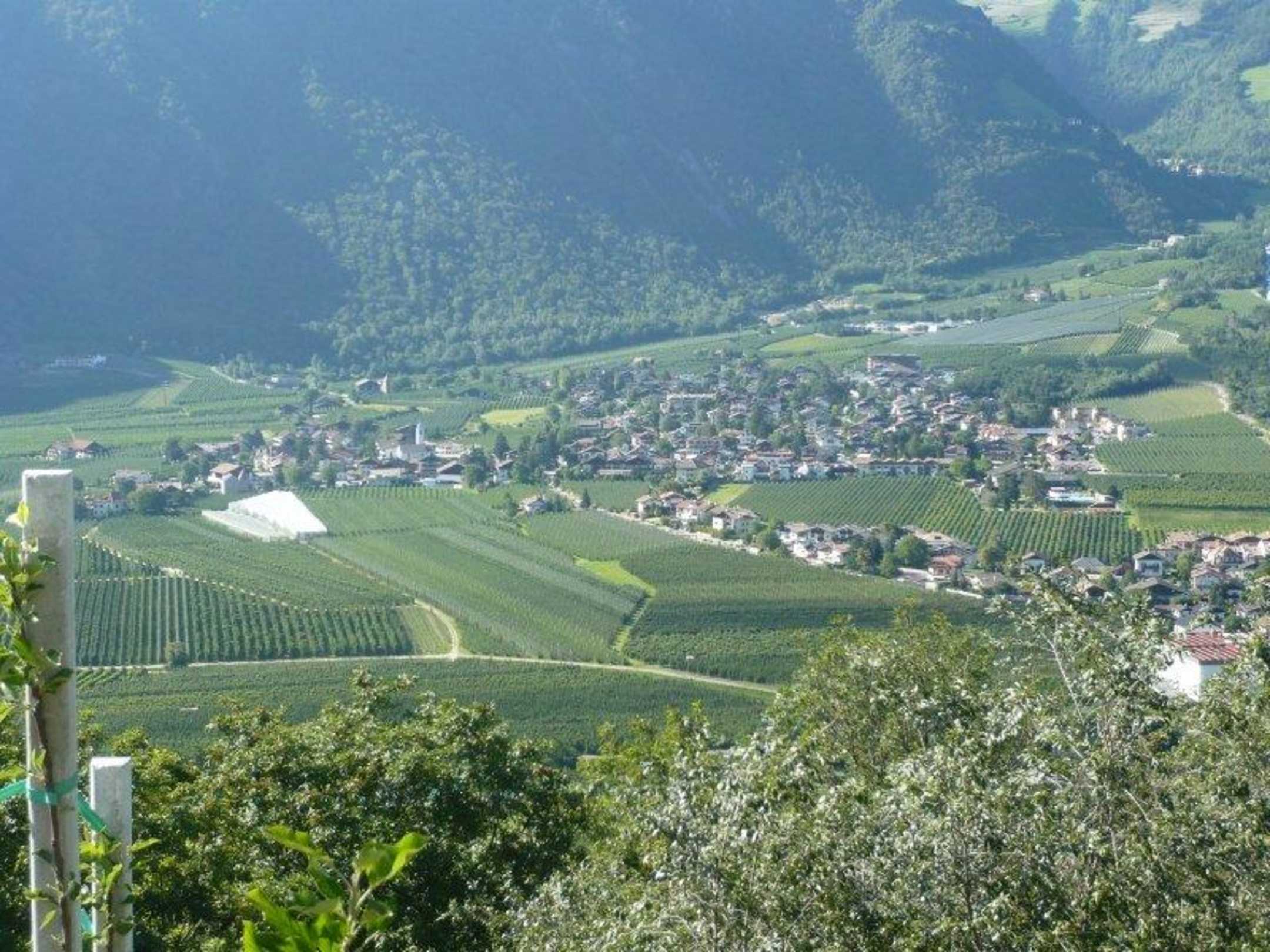 Blick auf Parschins vom Bio-Bauernhof aus.
