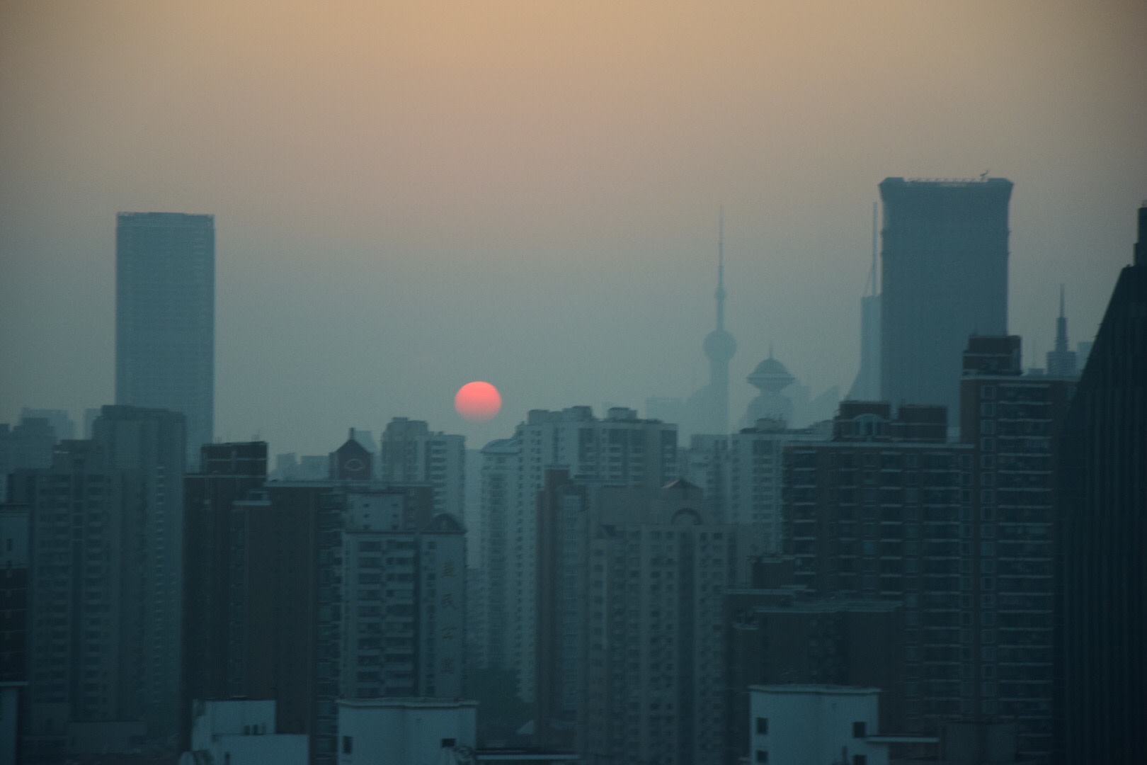 Sonnenaufgang über der Skyline, aufgenommen aus dem Zimmer im 21. Stock