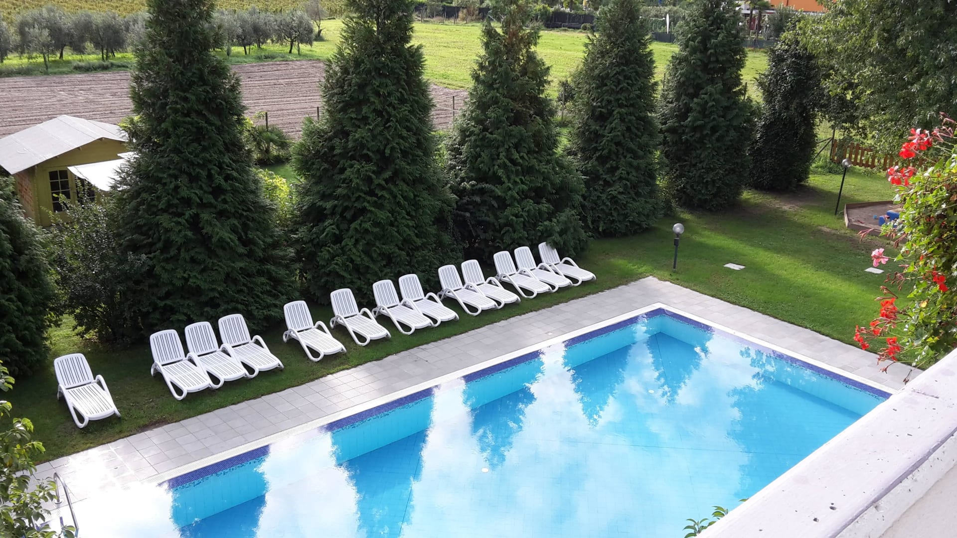 Blick vom Balkon auf den Pool