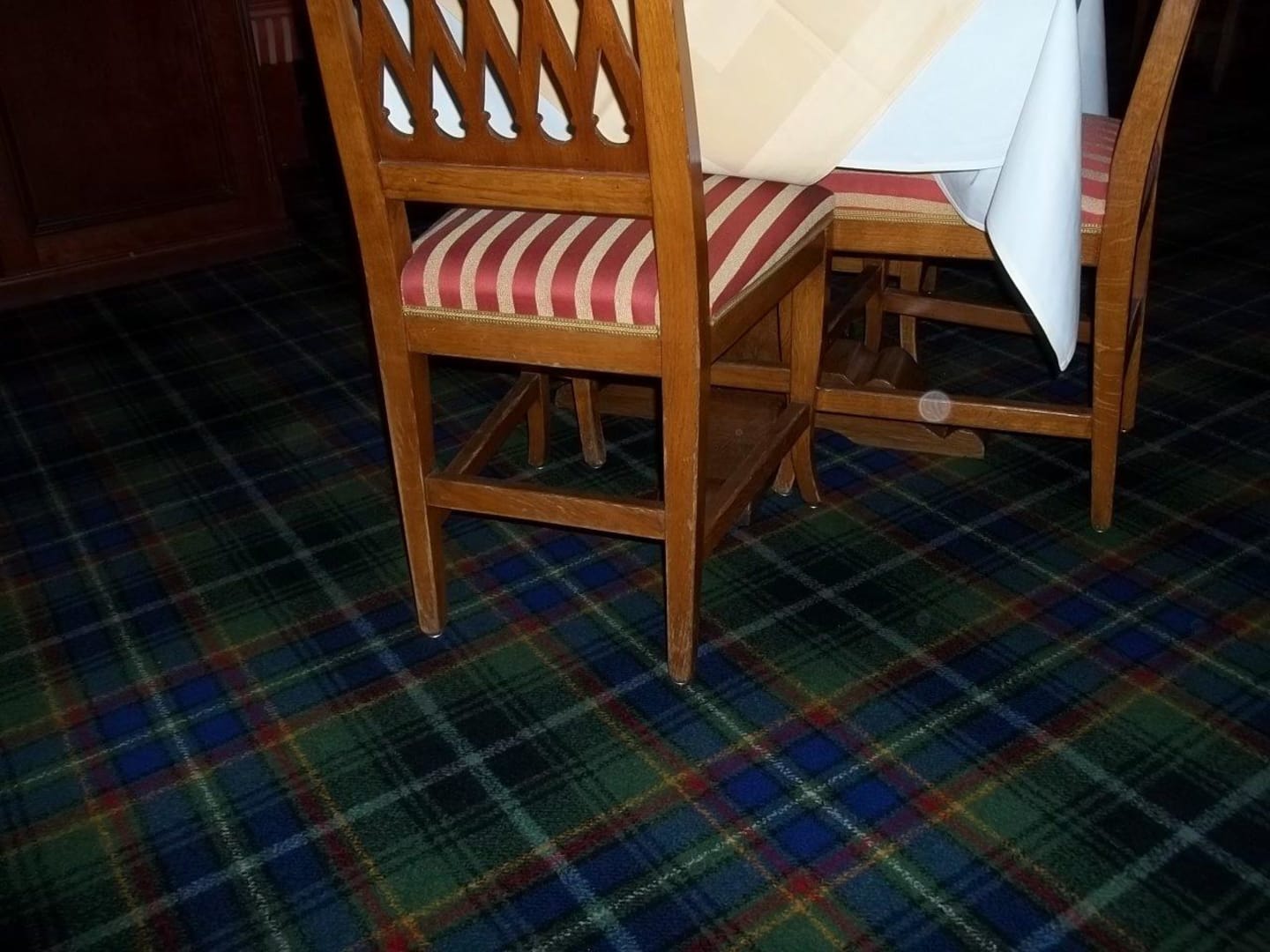 Stühle mit abgenutzter Lasur mit greller Auslegware