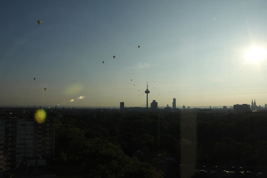 Ausblick aus Zimmer 1217 im 12. Stock mit Heißluftballons Morgens um 8 Uhr.