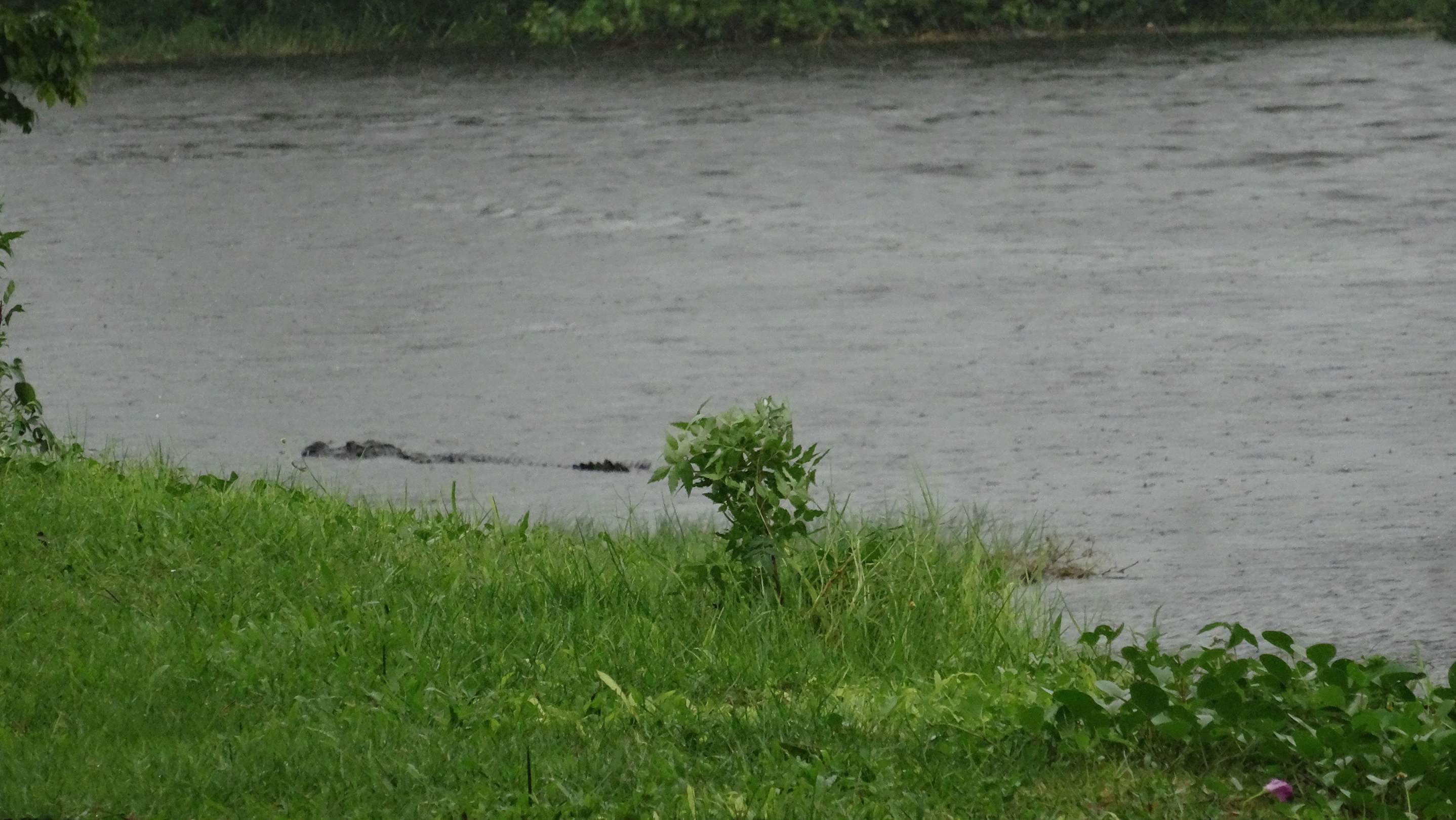 Blick von der Terrasse auf Krokodil im Fluss