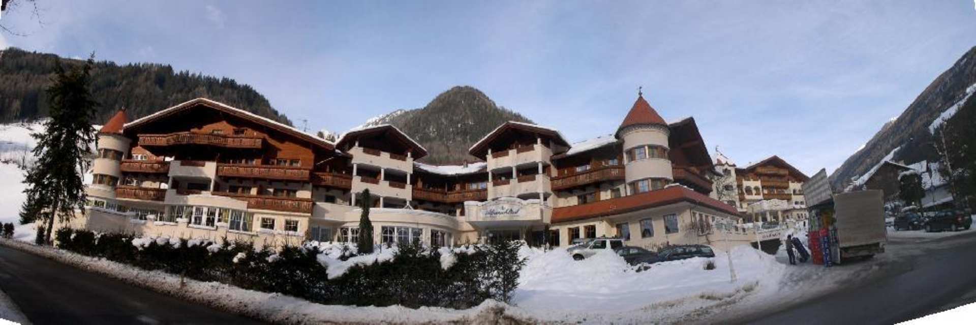 Panoramabild vom Hotel AlpenschlösslEin Panoramabild des Hotels Alpenschlössl in Steinhaus im Ahrntal. Ansicht von der Strasse aus.