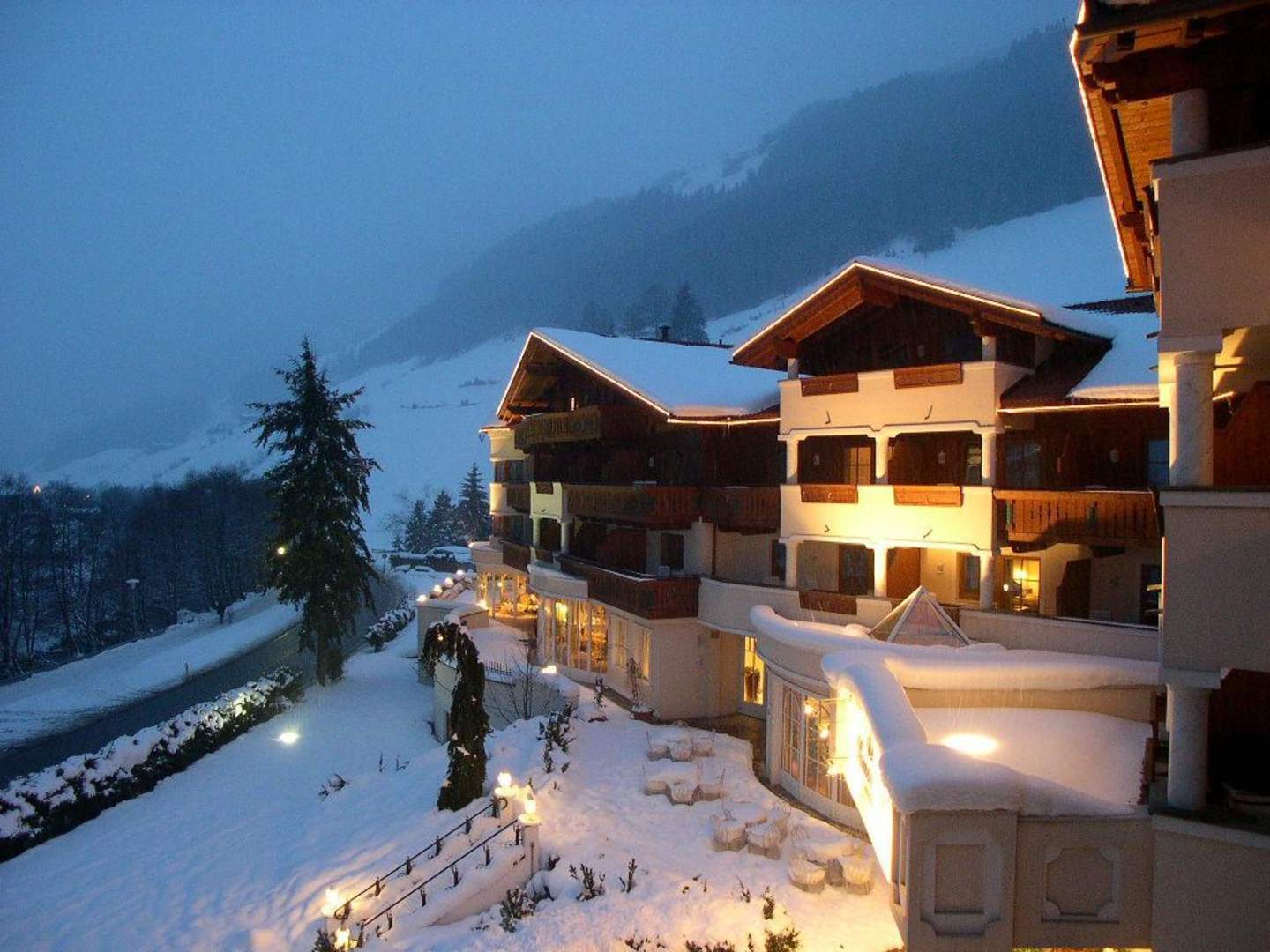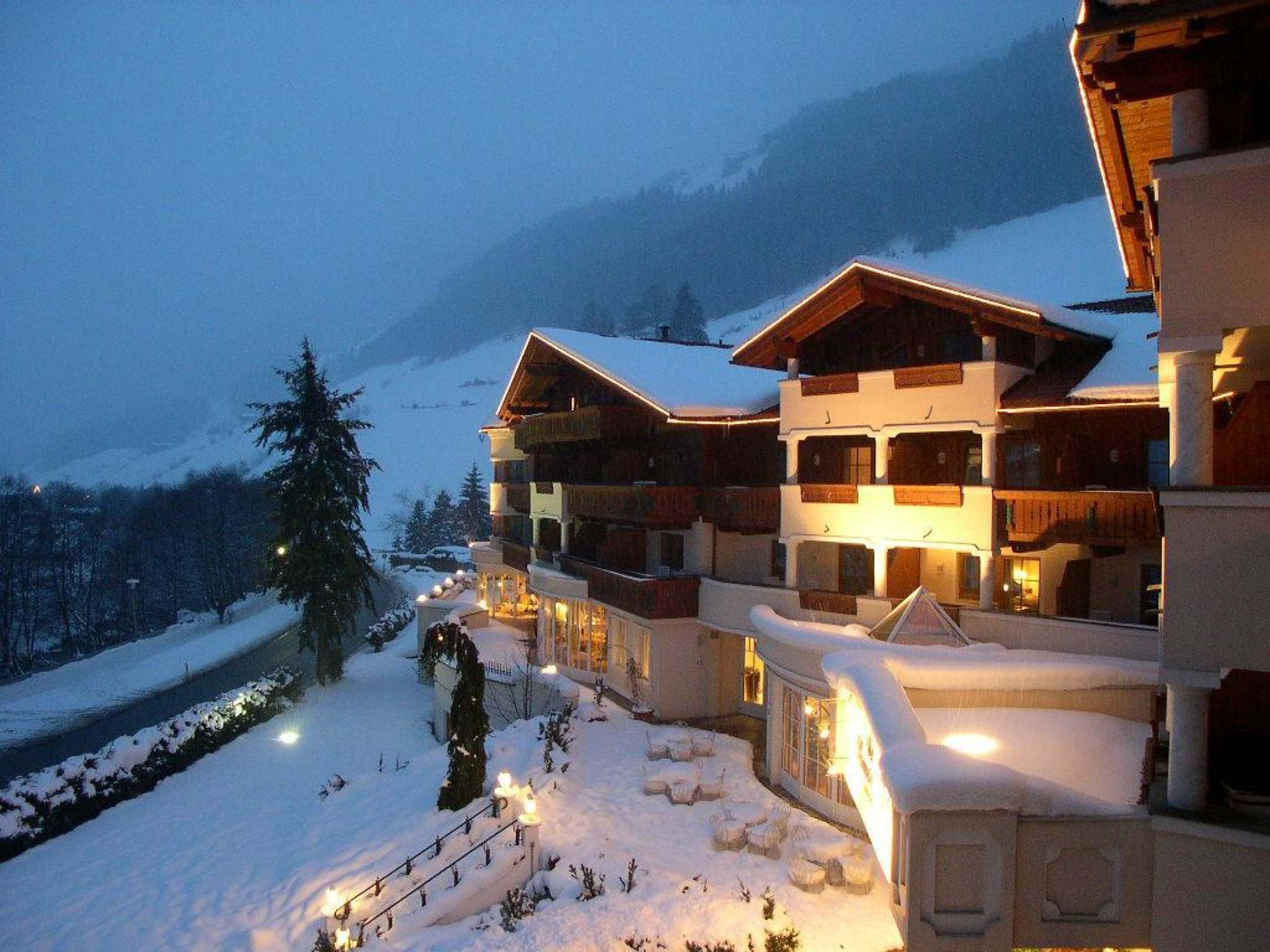 Hotel Alpenschlössl by NightAussicht vom einen Balkon der Schlösslsuite auf das Hotel Alpenschlössl ab Abend.