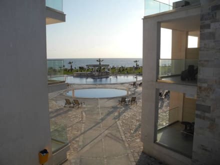 Blick über die beiden Pools auf Meer