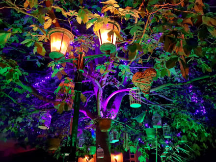 Beleuchteter Innenhof am Abend.
