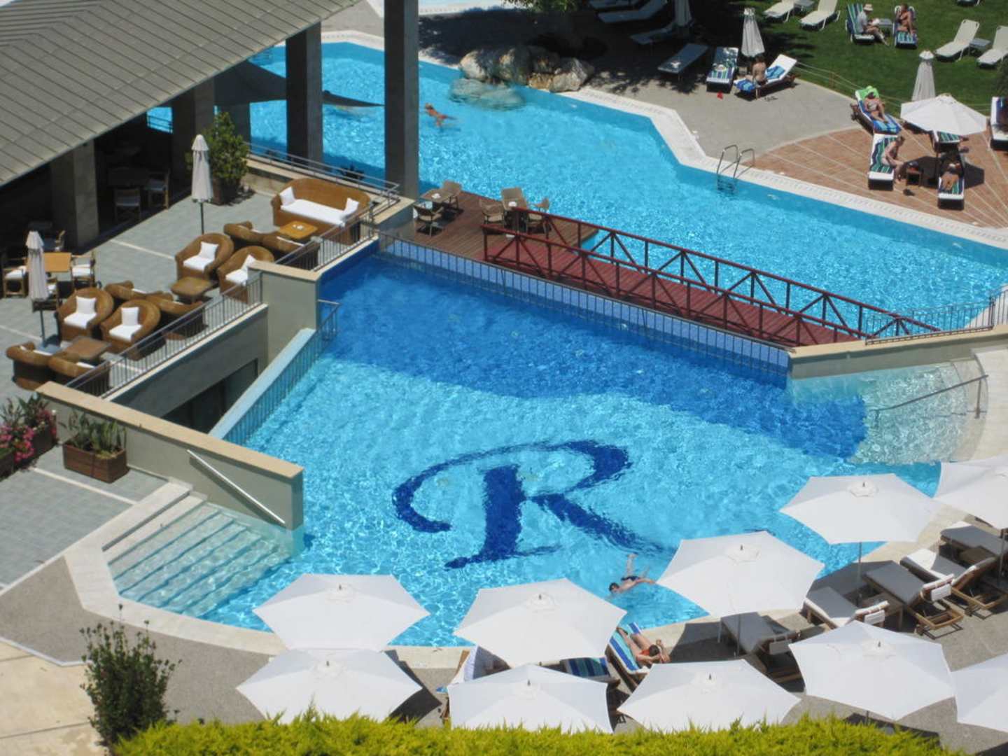 Blick von Dachterasse auf einen der 3 Hotel-Pools mit Pool-Bar