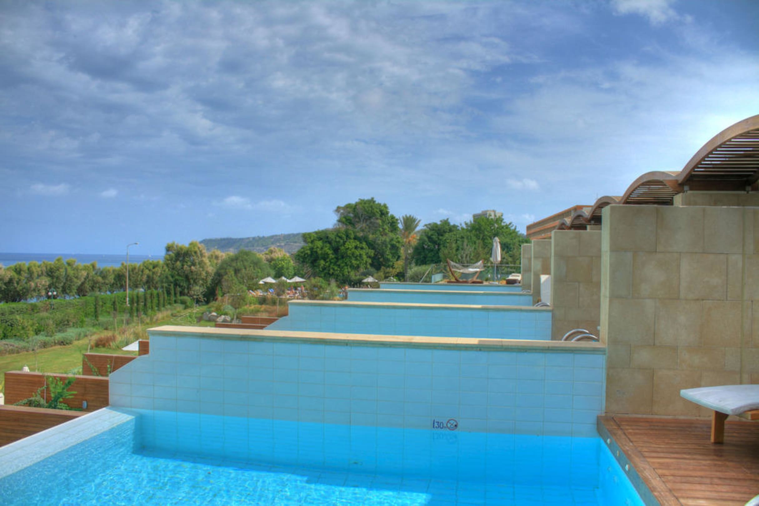 Blick von der Terrasse der Executive Suite Private Pool auf die Suites Private Pool und die Präsidenten Suite