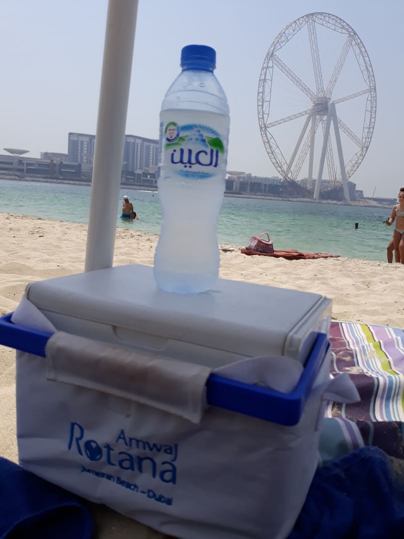 StrandKühlbox vom Hotel mit eisgekühlten Wasser. Blick auf das Dubai Eye, dass größte Riesenrad. Fertigstellung 2018