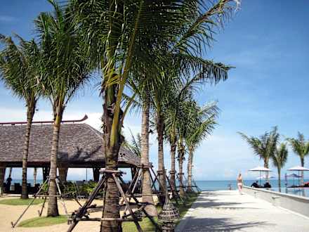 Links das Beachrestaurant und rechts zur Poolanalage.