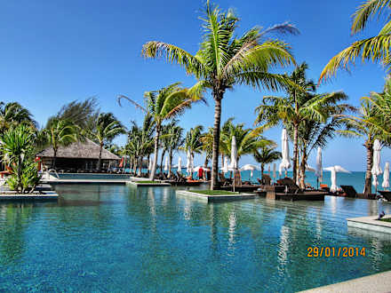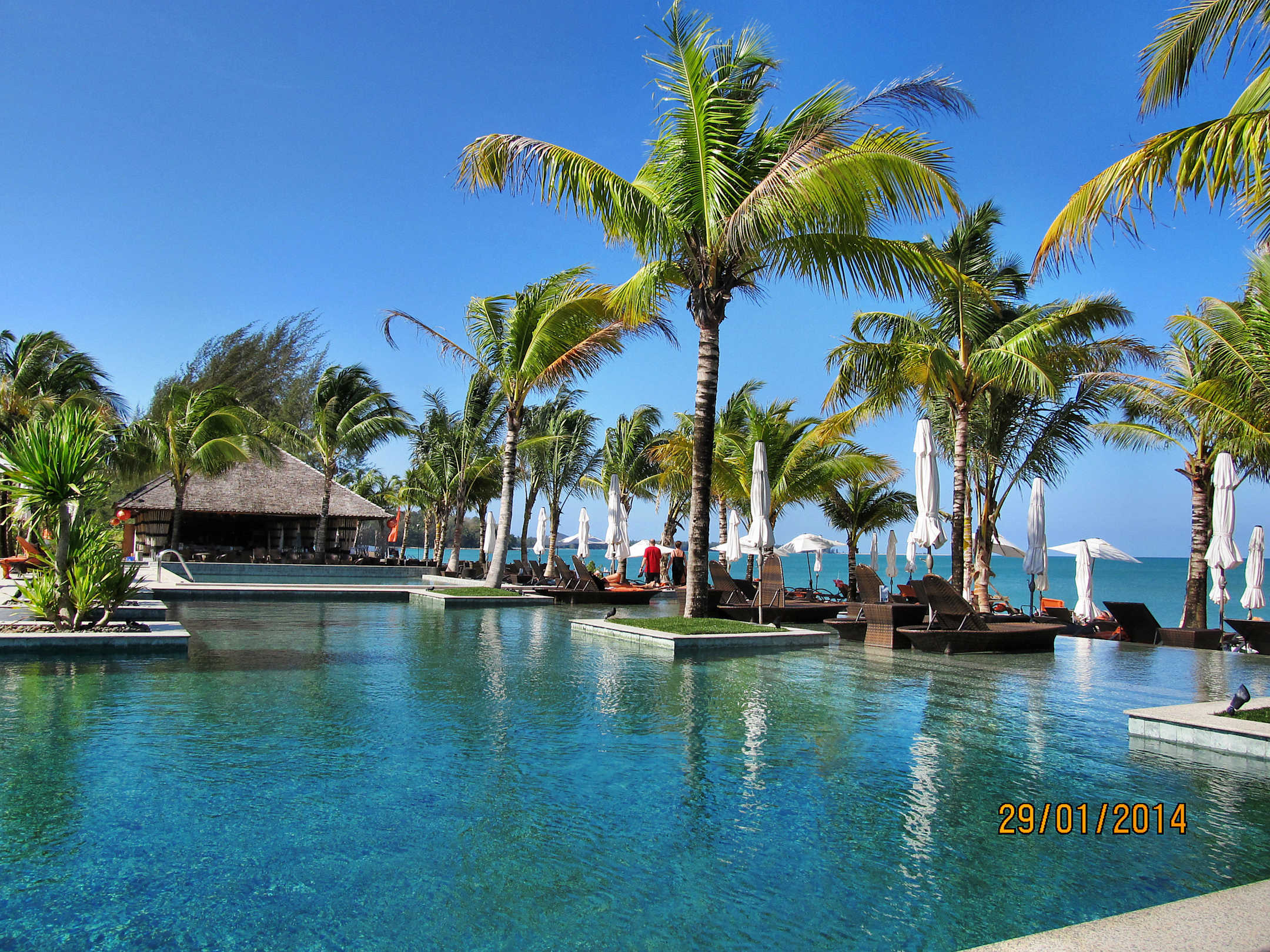 Blick vom Pool zum Strandrestaurant
