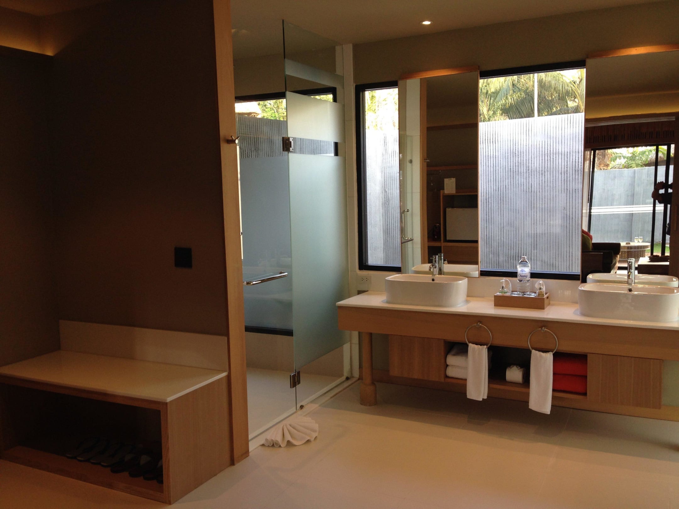 komplett verglast, zum Teil satiniert- Links begehbare Dusche, Mitte Waschbecken und rechts die Toilette. Geht so nur durch die Privatspähre, weöche durhc die Ummauerung der grundstücke entstanden ist.
