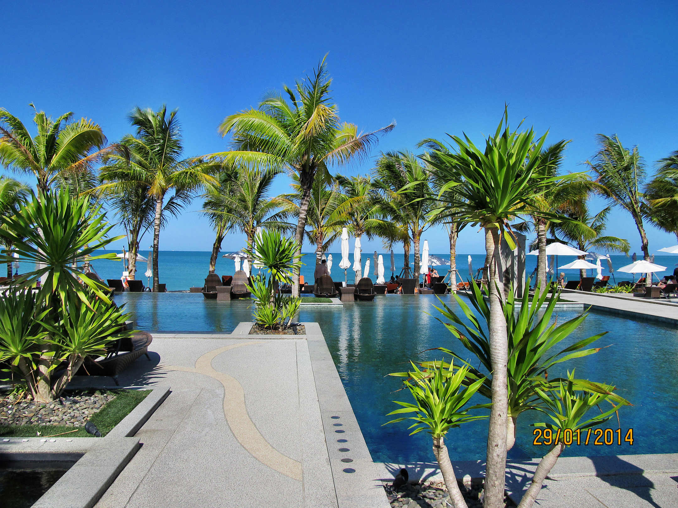 Blick von Poolliegen zum Strand