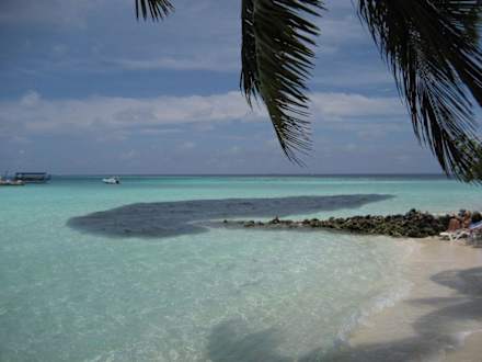 Strand mit FischschwarmAussicht vom Strand vor unserem Bungalow auf das Meer, das schwarze im Wasser vor den Steinen ist eine riesiger Fischschwarm.