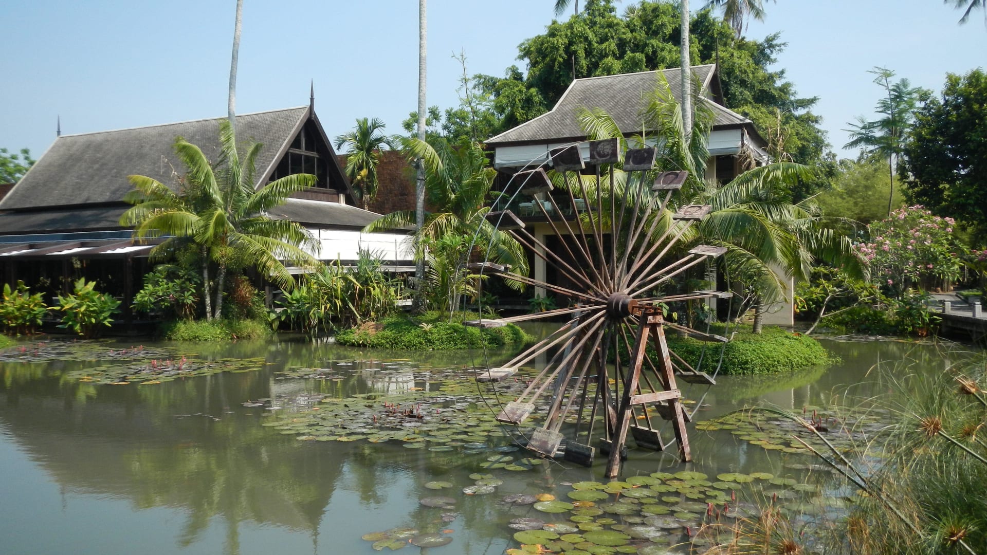 Blick über die Lagune Richtung Restaurant und Baum