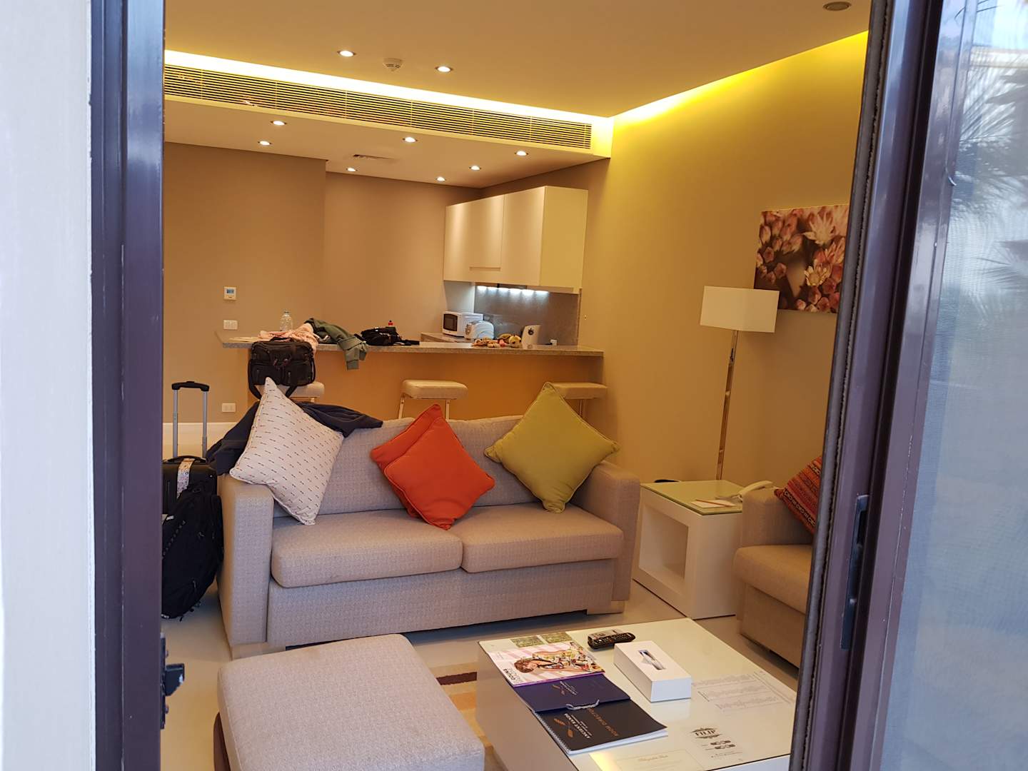 ZimmerWohnbereich mit dahinterliegender Küche (inkl. Spülmaschine, Waschmaschine, Kühlschrank, Toaster, Kaffeepadmaschine und so wieter