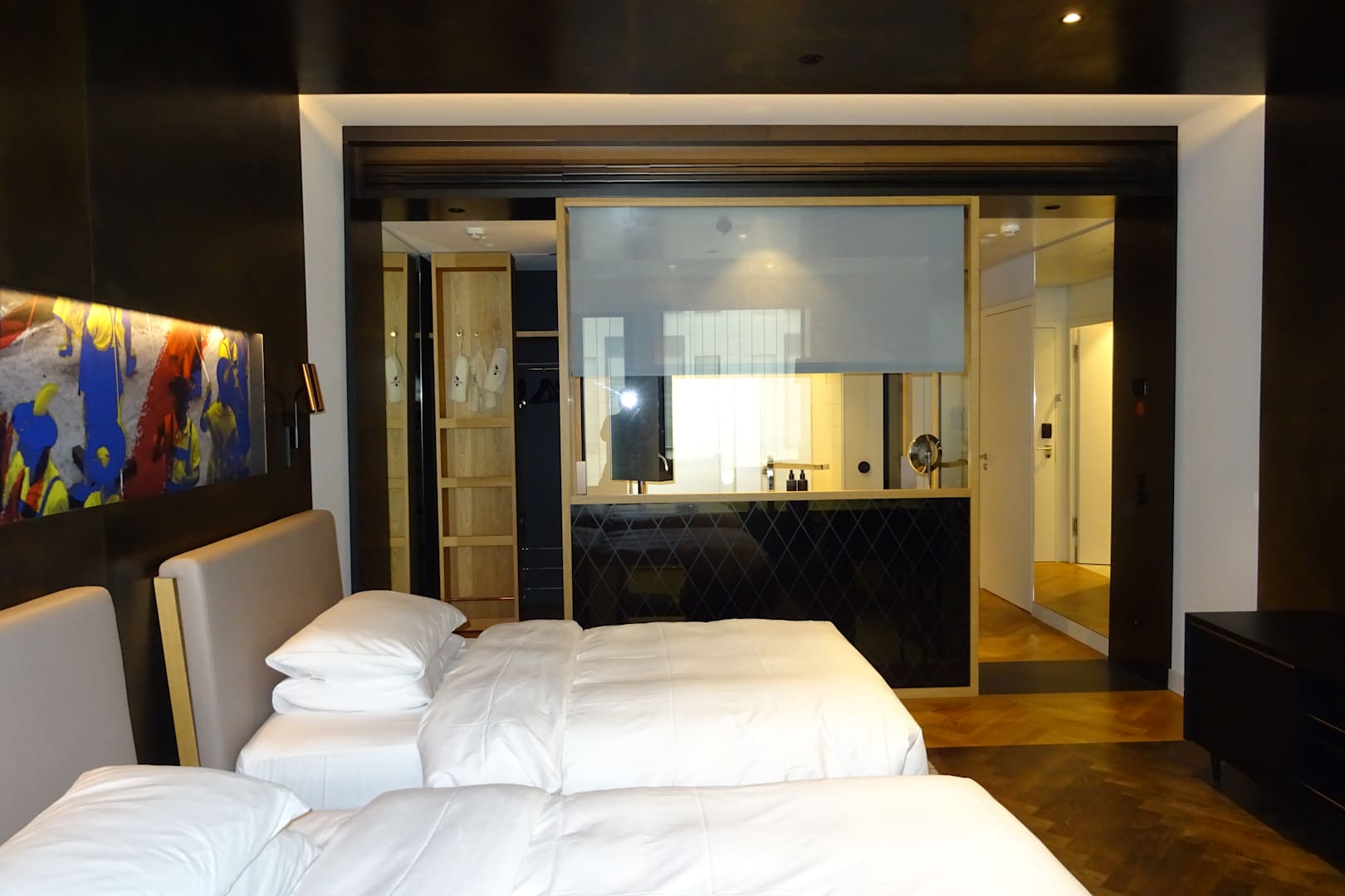 Doppelzimmer - Blick Richtung Bad (Glasscheibe - Jalousie lässt sich individuell öffnen und schliessen)