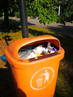 Voller Mülleimer auf dem Parkplatz des Hotels.