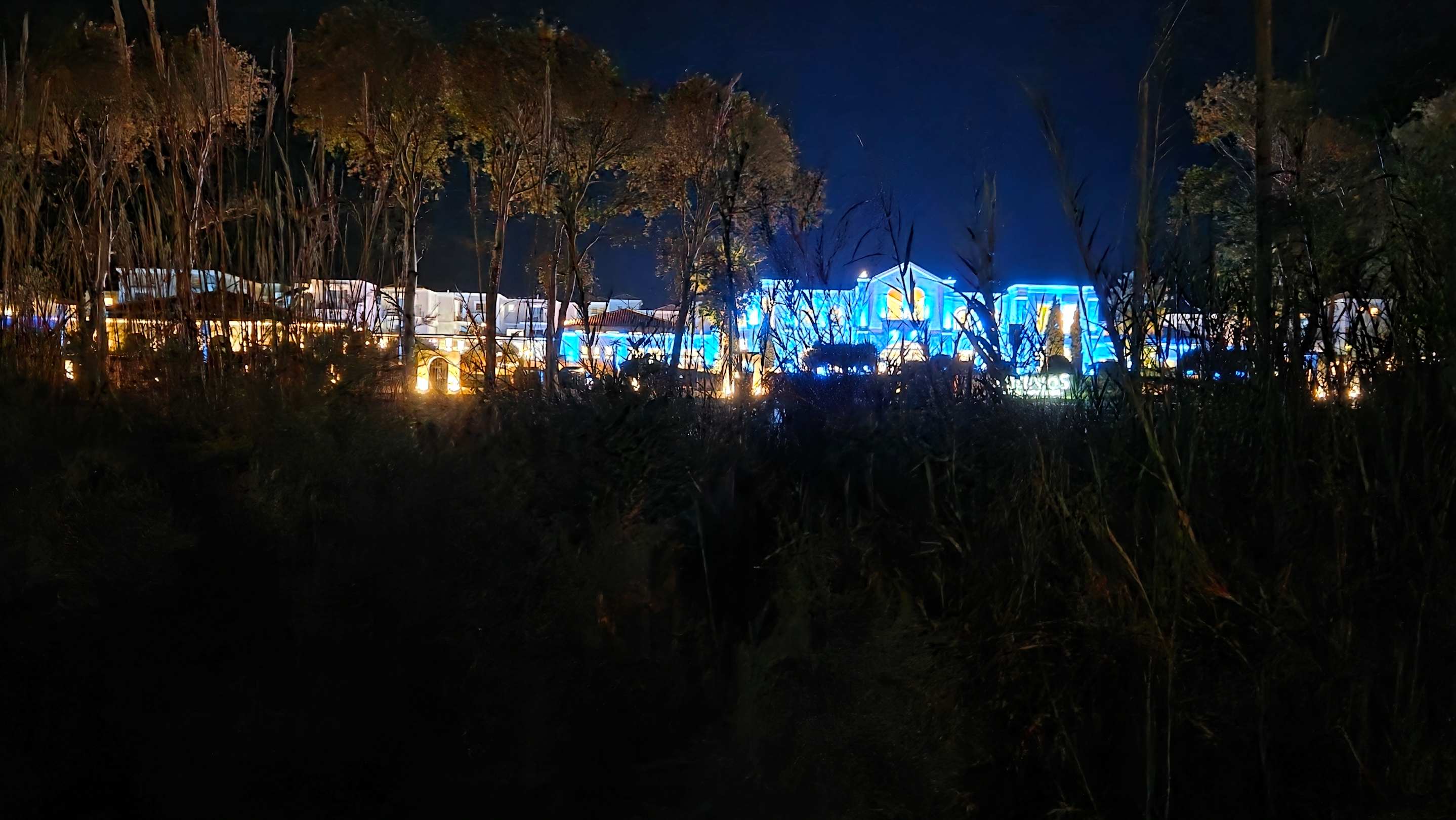 Aussenansicht des Hotels bei Nacht vom Strand kommend