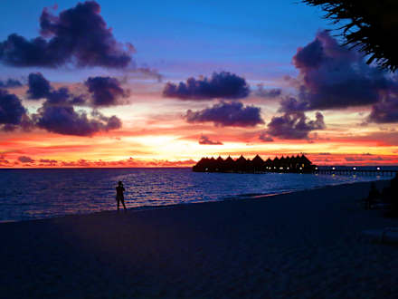Sonnenuntergang und Wasserbungalows