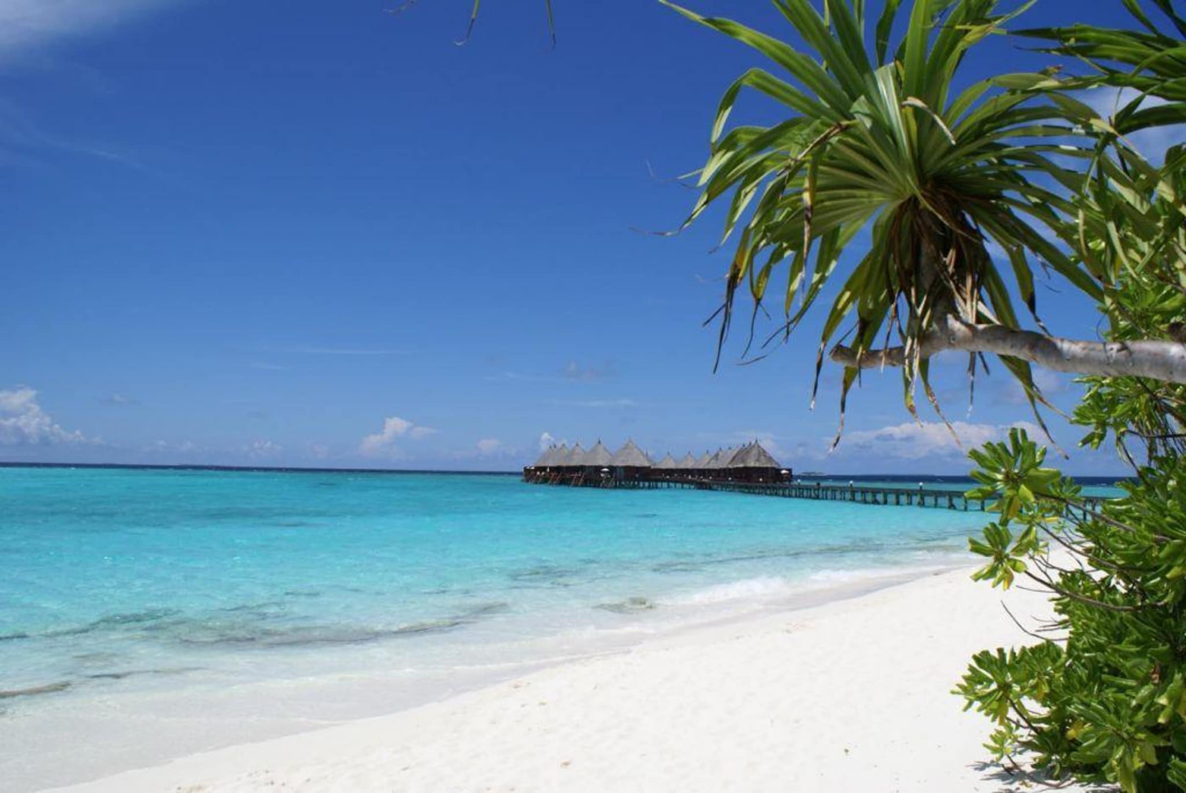 Am Strand5 Meter vor unserem Strandbungalow. Aussicht auf die Wasserbungalows und die Sundown-Bar...