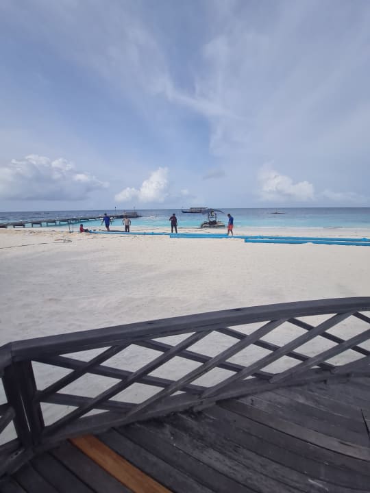 Tägliche Arbeiten am Strand um mittels mehrerer Sandabpumpmaschinen Sand abzupumpen und in Sandsäcke zu füllen, da die Insel langsam absinkt. Mehrere Strandbungalows sind deshalb bereits jetzt nicht mehr zu vermieten.