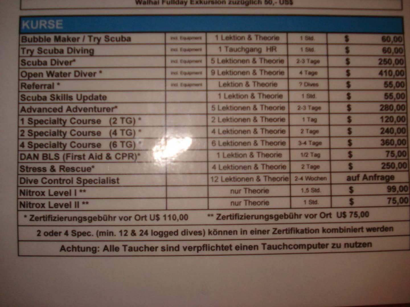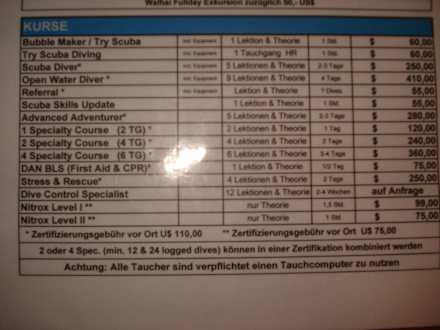 Preisübersicht Tauchbasis