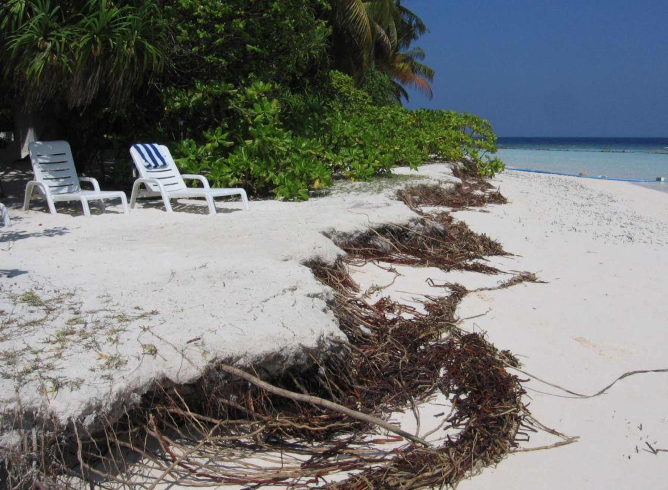 Man sieht das vom Monsun freigespülte Wurzelwerk der Palmen und Büsche. So sieht es vor den Bungalows von Nr. 101 bis ca. 120 aus!