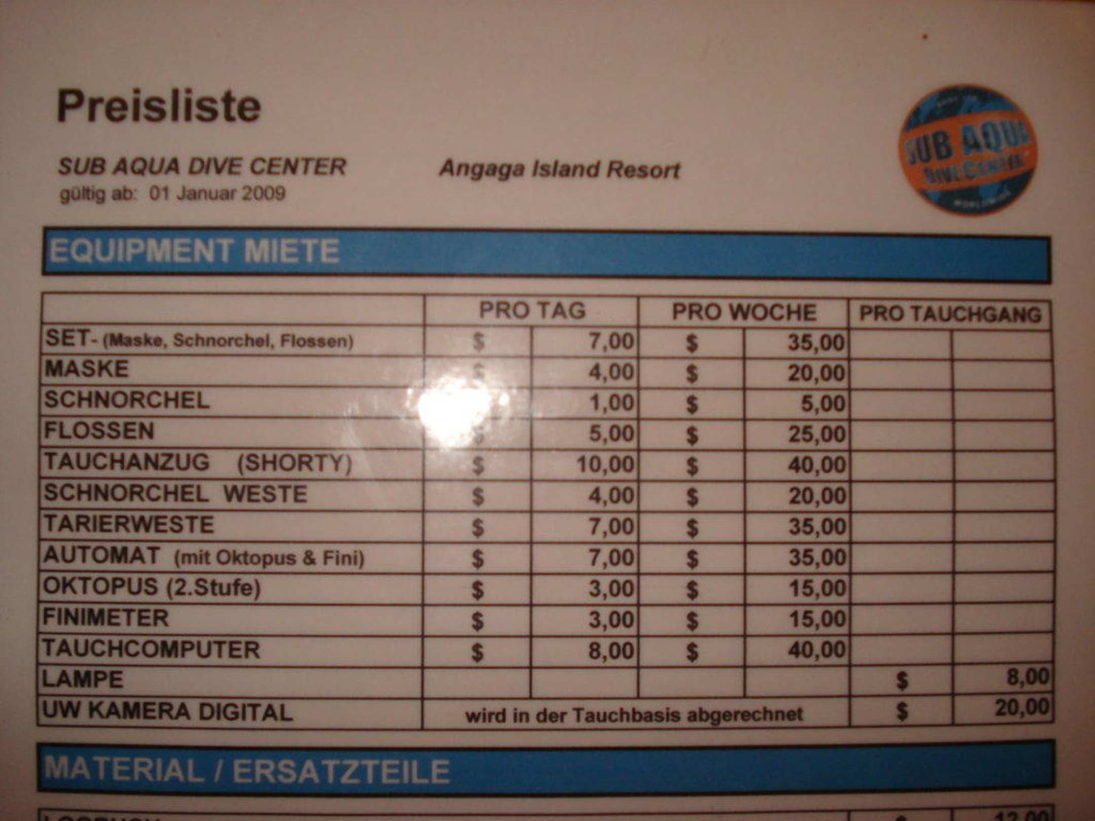 Preisübersicht Tauchbasis