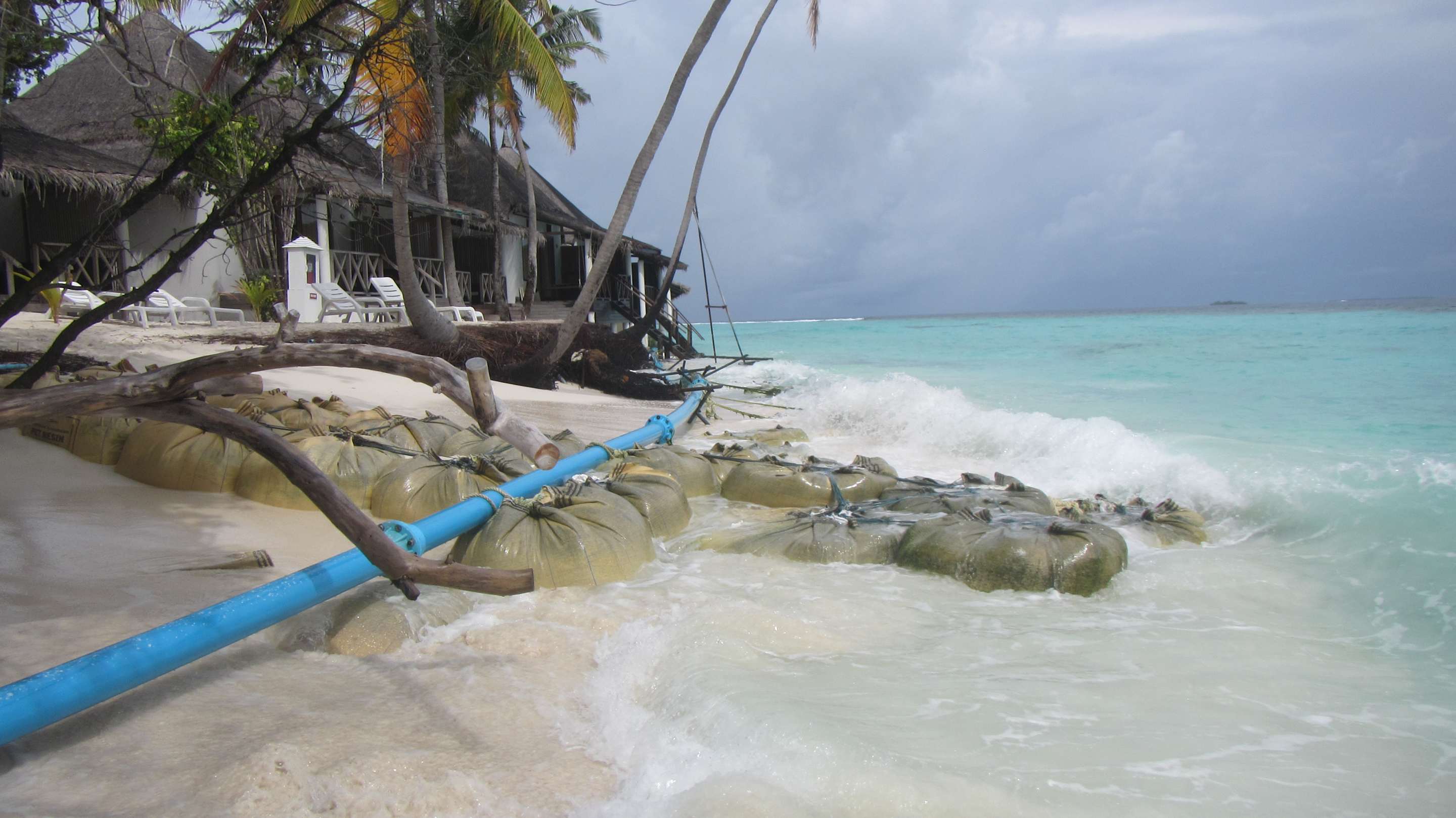 StrandHier etwas größere Sandsäcke vor den Strandbungalows und den langen blauen Abpumprohre. Maledivische Urlaubsinsel, sieht wohl anders aus.