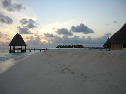 Strand von AngagaHier sieht man eine Anlegestelle von den Booten, in der Ferne die Wasserbungalows und rechts einen Teil des Restaurants.