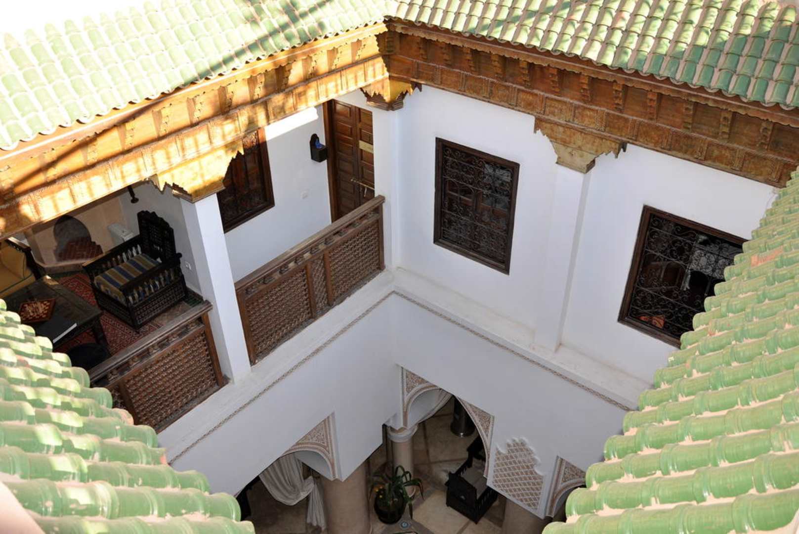 Blick von der Dachterrasse in den Innenhof und Zimmer Nr. 3