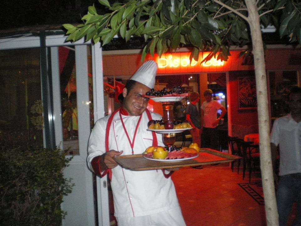 Hier kommt der Koch mit einer wunderschönen Obstplatte als Überraschung zum 11 Hochzeitstag.Das Pärchen hat sich sehr über diese Aufmerksamkeit gefreut. Hier nochmals ein dickes Danke schön für diesen tollen Abend.
