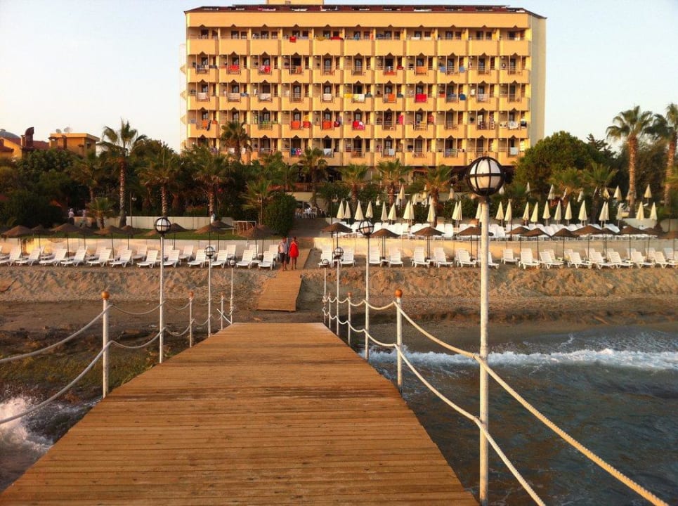 Blick vom Steg auf den Strand und das Hotel
