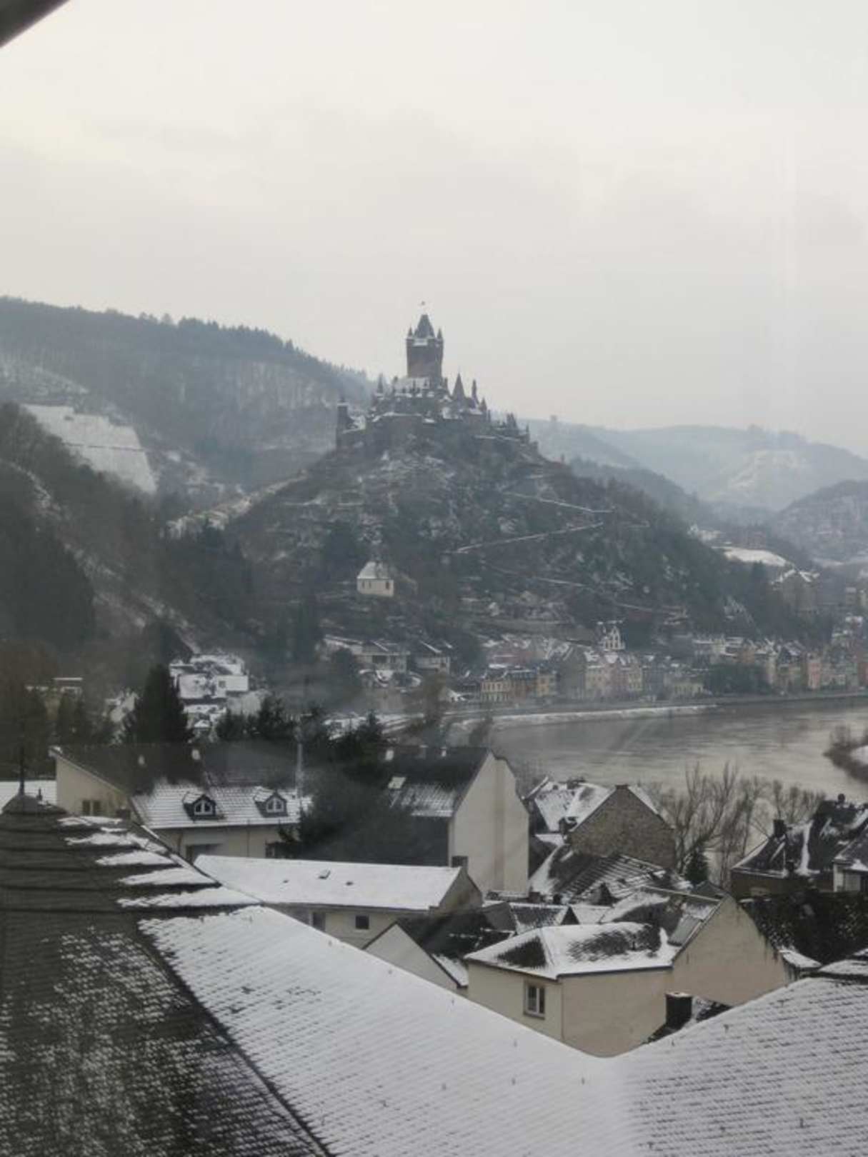 Ausblick auf Moselschleife und Burg im Winter
