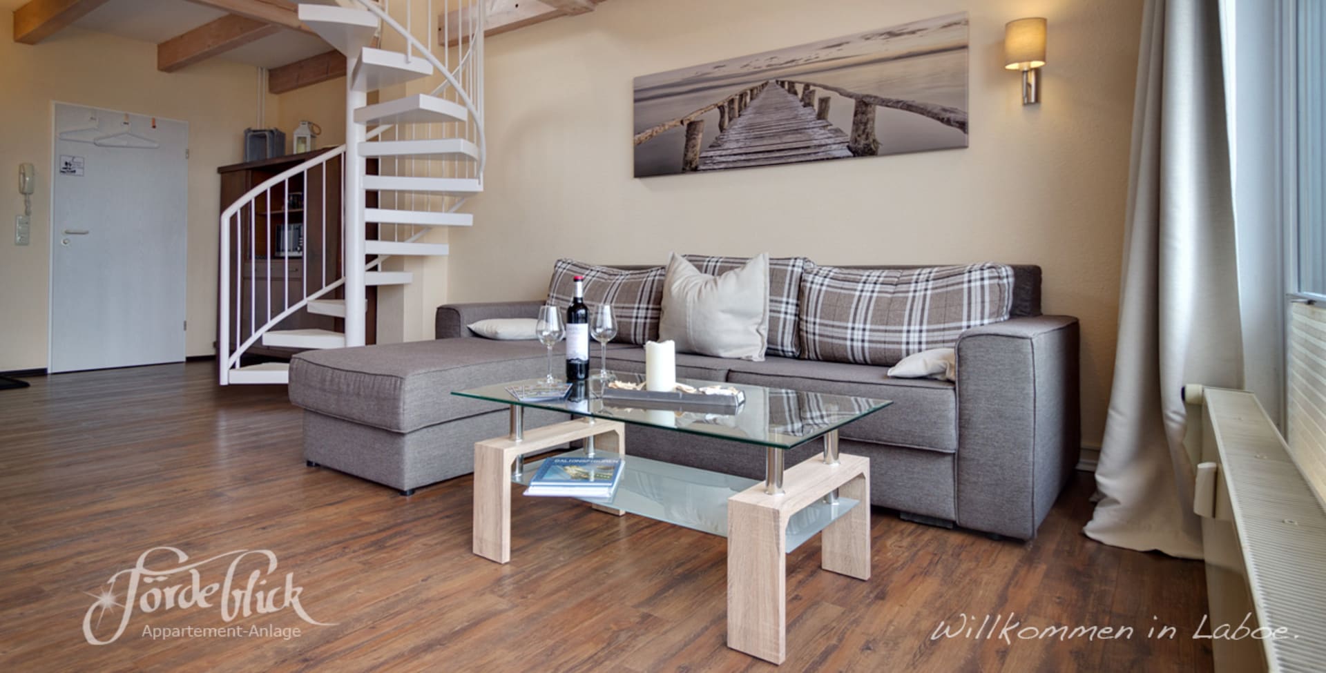 Galerie-Appartement mit gemütlicher Couch. Die Couch ist ausziehbar und biete 2 bequeme Schlafplätze. Die Wendeltreppe führt zur Galerie mit einem Doppelbett. Herrliche Aussicht zur Kieler Förde