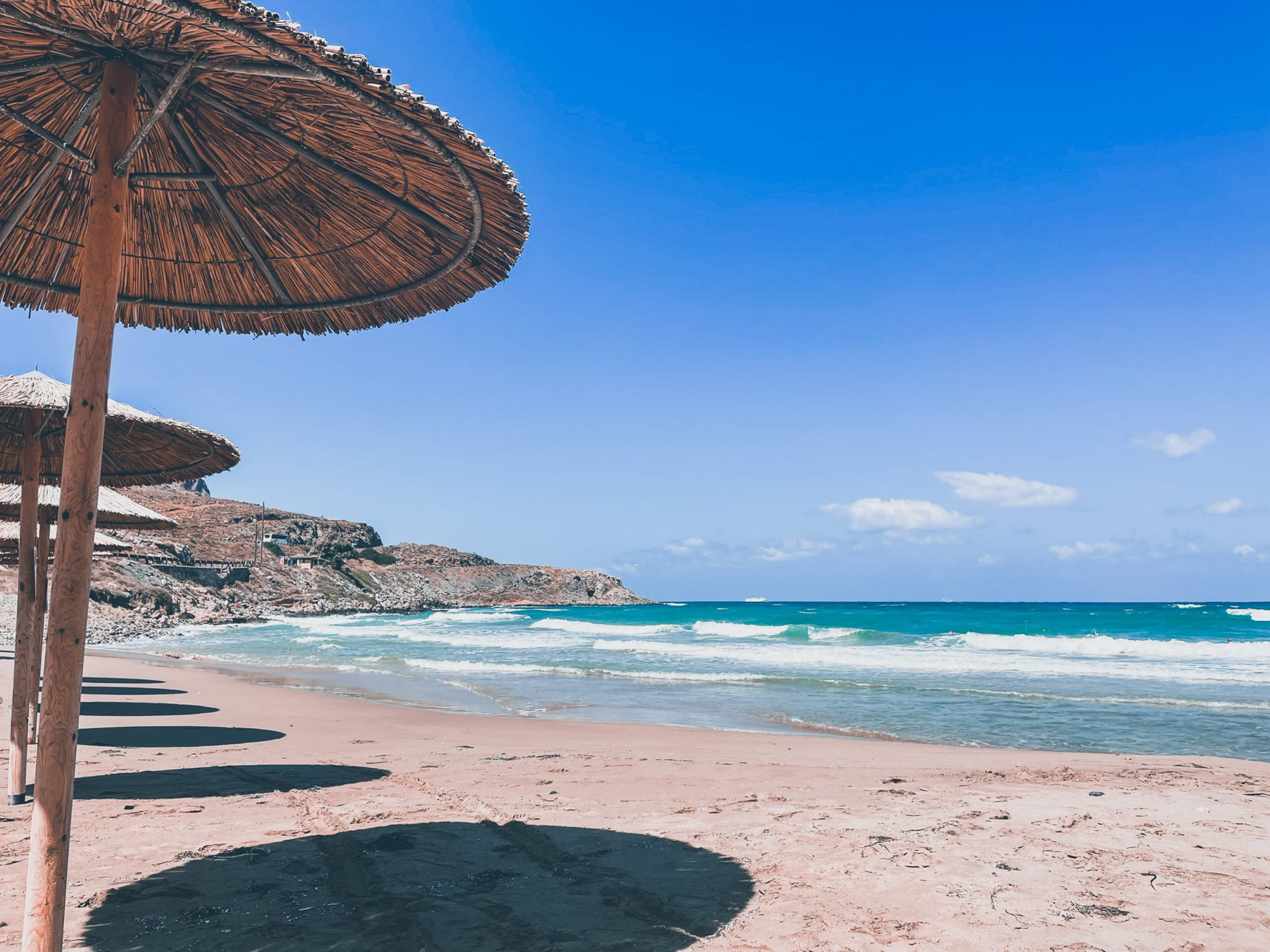 Strand von Arena Beach in Gouves mit günstiger Mietmöglichkeit für Liegen (3€ am Tag). Bewachter, aufgeräumter und großer Strandabschnitt mit Essens- und Getränkeangebot vor Ort.