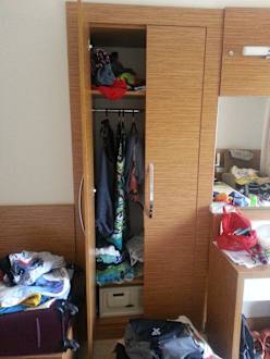 Schrank von vielleicht gerade einmal 1 m breite für 3 personen = das ist der Witz. (Ablagemöglichkeit für 3 Koffer links daneben.) Zimmergröße und Ablagemöglichkeiten = einfach nur lächerlich)