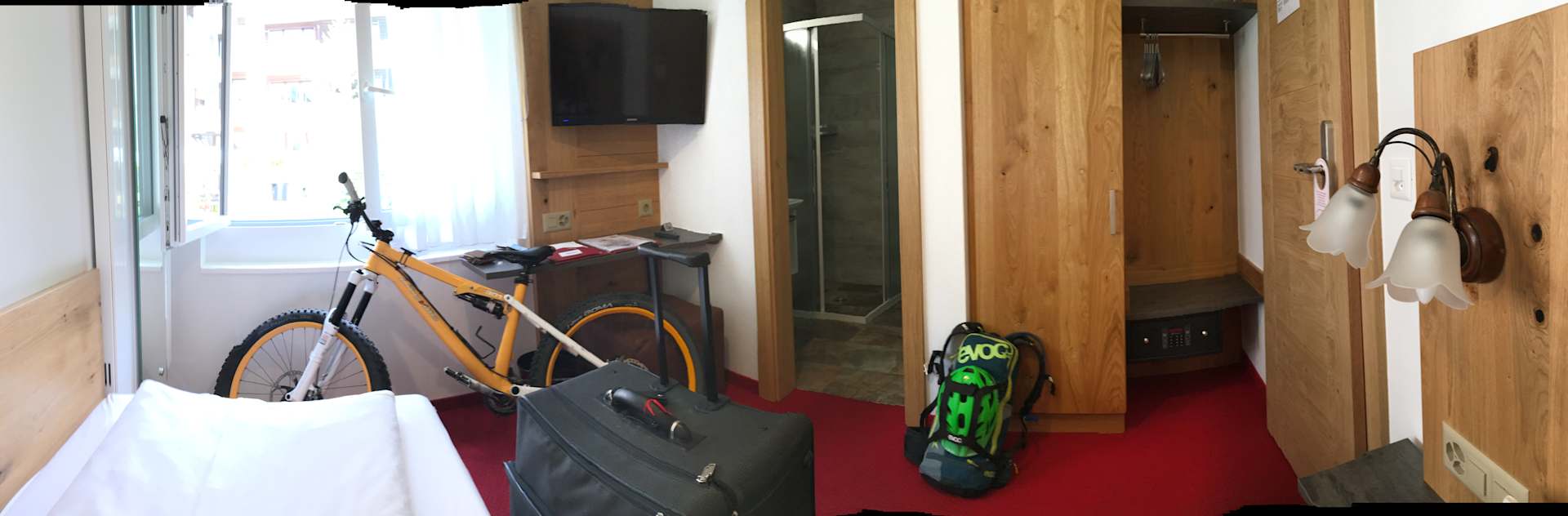 ZimmerEinzelzimmer mit ausreichend Platz und perfekter Ausstattung (das Bike wurde später im Skikeller (Hauptgebäude) verschlossen deponiert)