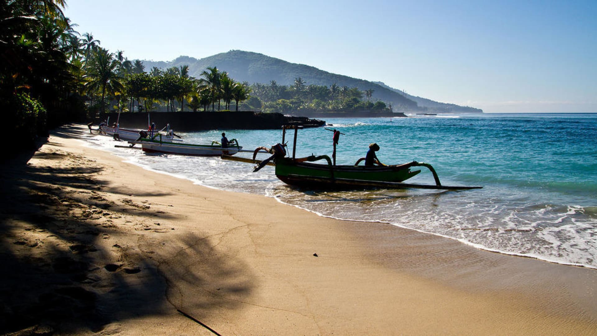 Boote holen Gäste am Strand vom Anom-Beach-Innwartende Boote auf Gäste, die einen Ausflug gebucht haben