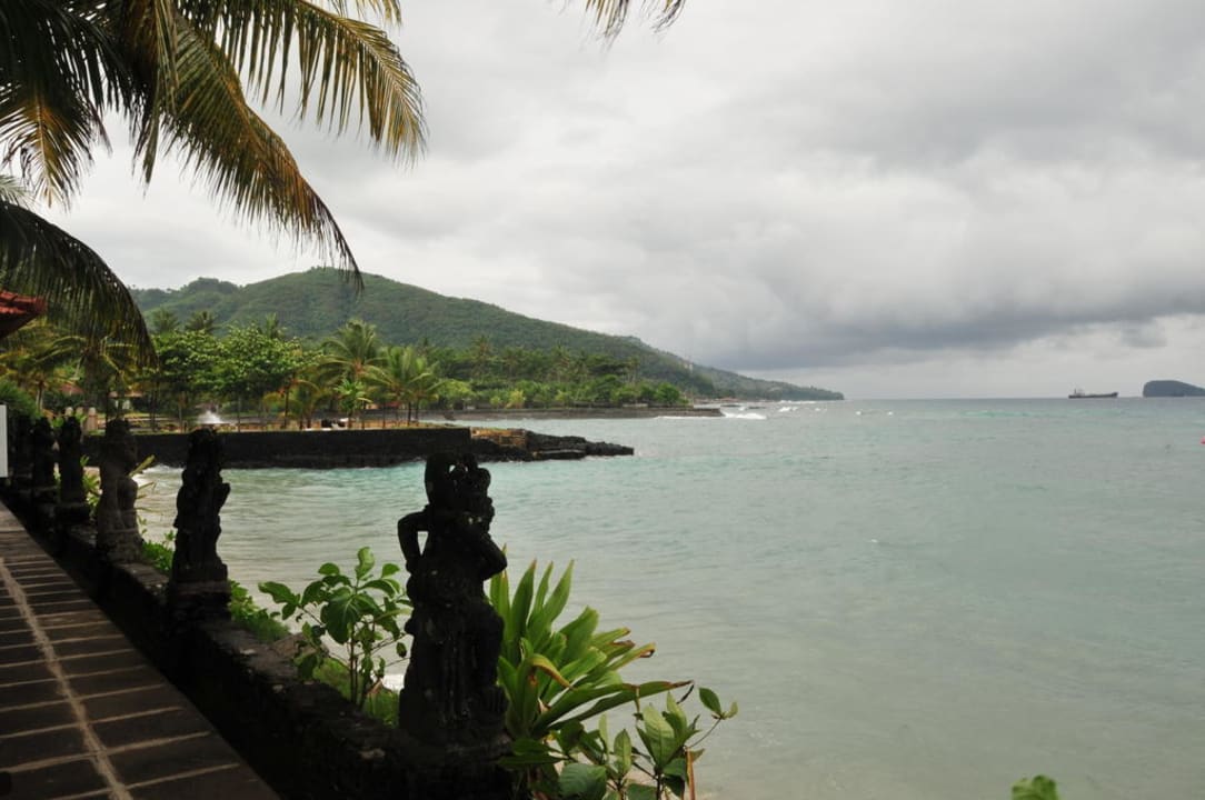 Blick auf den Küstenabschnitt von der TerrasseMan sieht deutlich im Hintergrund das Ende des Strandabschnitts