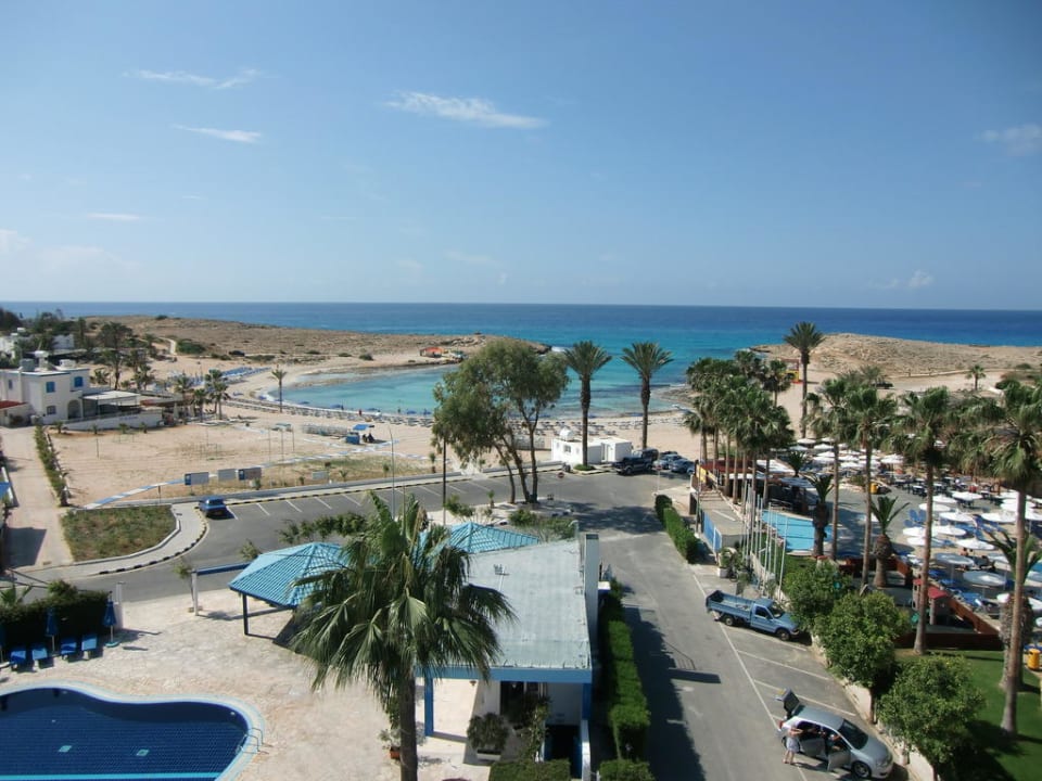 Blick von der Südseite des HotelsAusblick von der Südseite des Hotels in Richtung Strand bei strahlend blauem Himmel, morgens um 08.00 Uhr