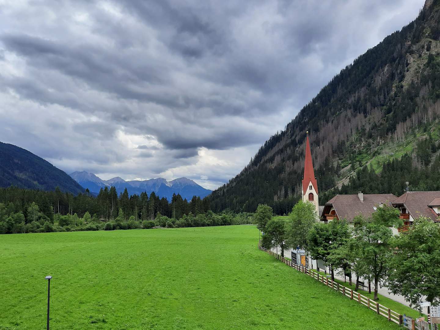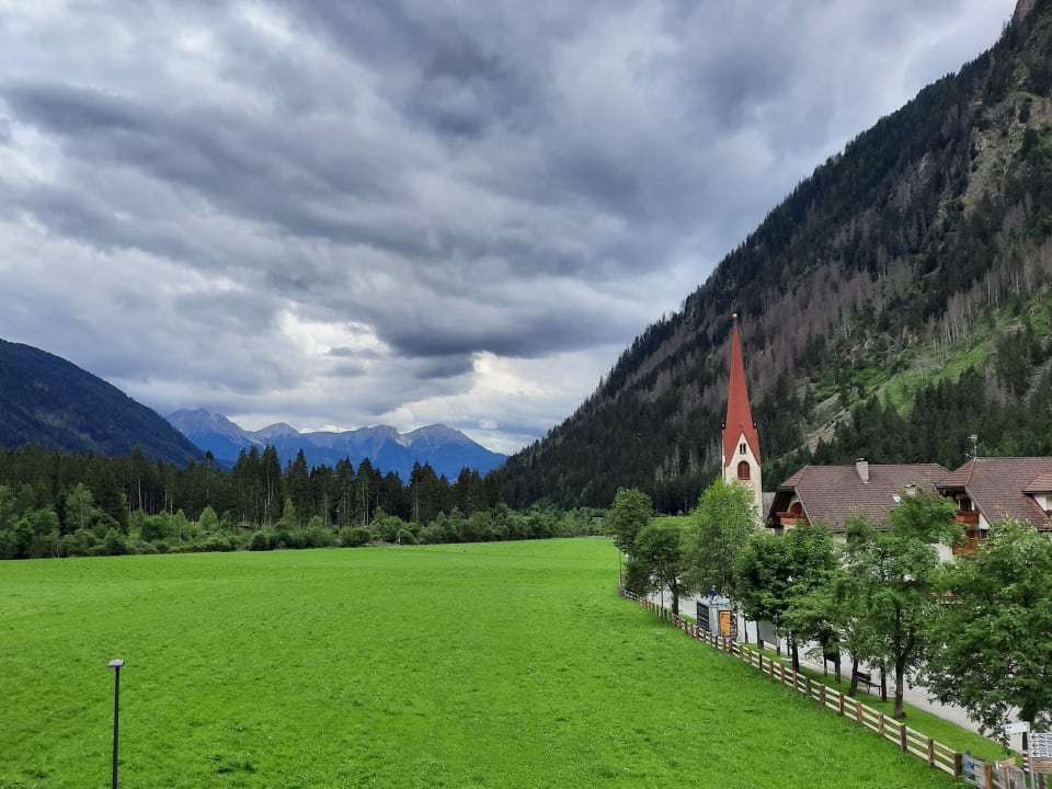 Ausblick auf Kirche, Bushaltestelle und Hotel Messner/Westseite und Talanfang