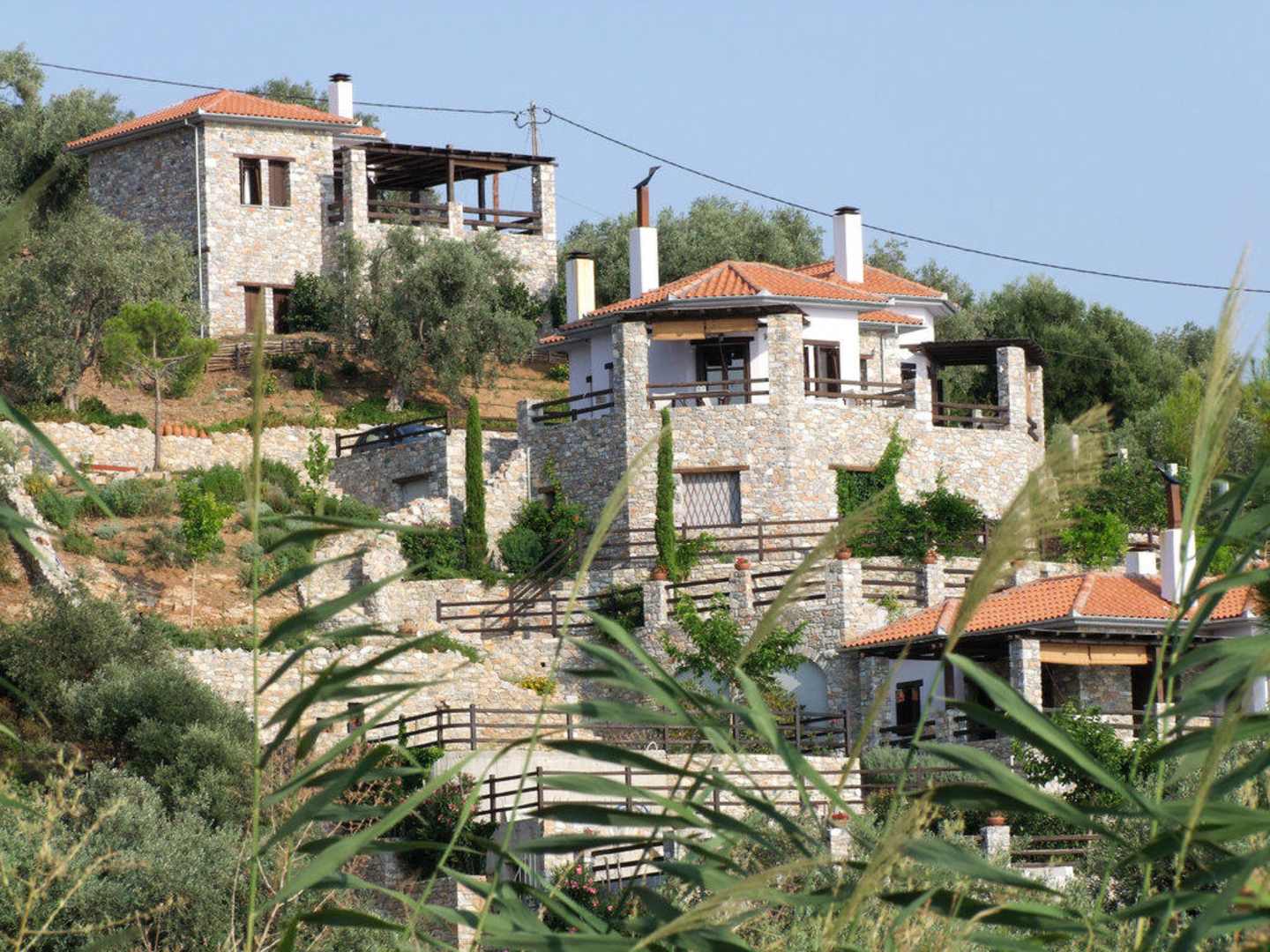 Blick auf Anthilion Houses vom Agia Efthimia Beach aus.