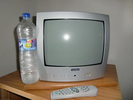 Sat.-TV im möchte-gern Superior-Zimmer (303)Neben dem Fernseher steht eine 1,5 Liter Wasserflasche. Man beachte, dass das Gerätegehäuse mit der Flasche abschließt und nicht der Rand des sichtbaren Bildes.