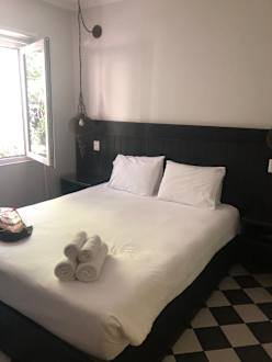 Zimmer mit Bett und schönem schwarz-weißen Fließenboden. Der Blick ging raus zur Terrasse
